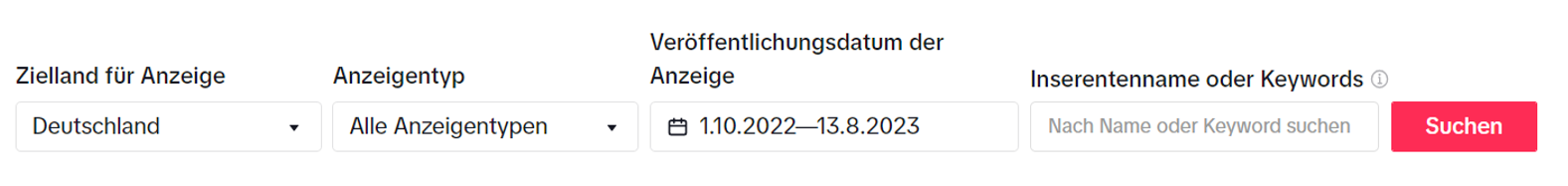 Suchfunktionen: Die TikTok Anzeigen Bibliothek verfügt über eine Suchfunktion, die es Werbetreibenden ermöglicht, nach bestimmten Marken, Kampagnen oder Keywords zu suchen. Dies erleichtert das Auffinden von relevanten Informationen.